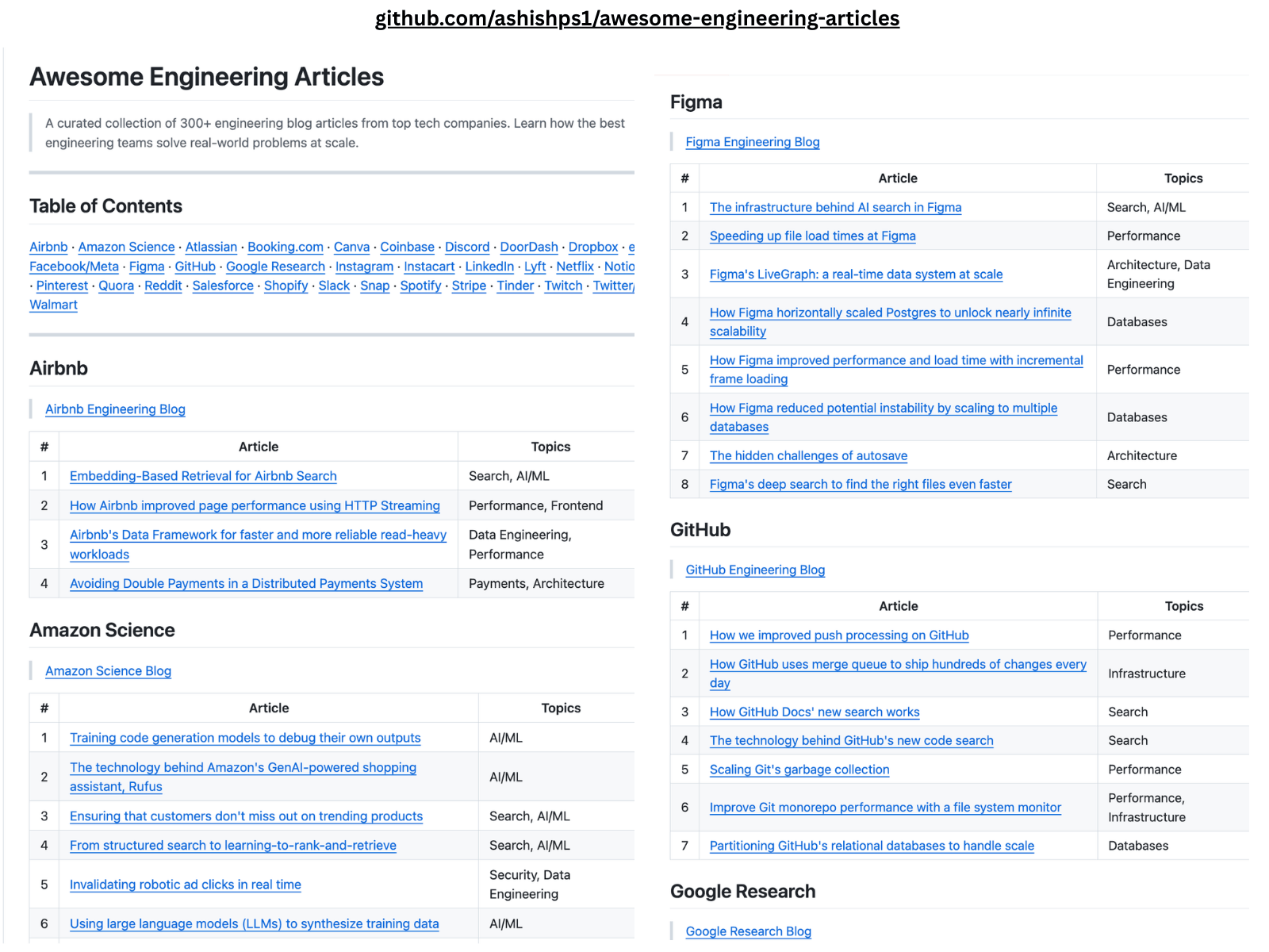 I’m excited to share a new GitHub repository where I’ve curated 300+ high-quality engineering articles, organized by top tech companies.