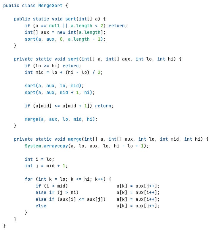 First, it recursively splits the array in half over and over. That’s the log n part.