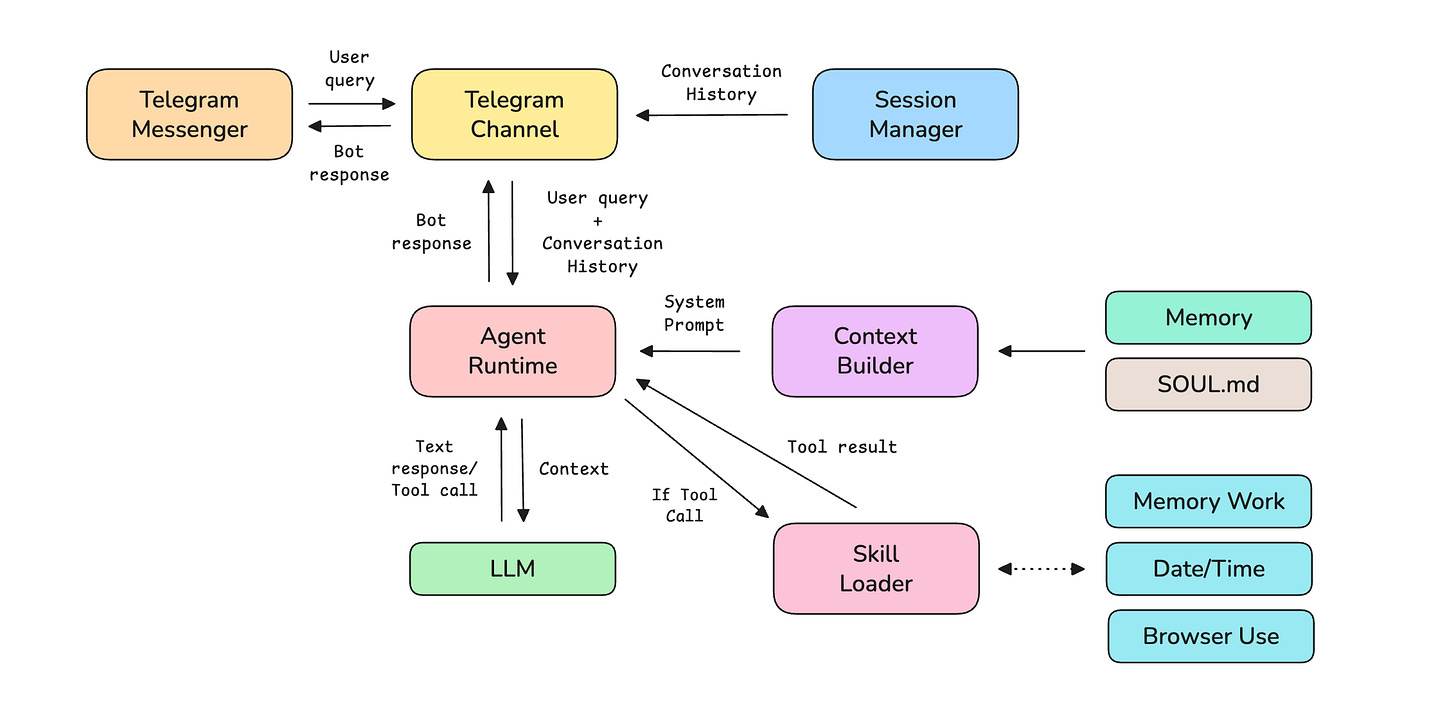 telegram:123) to keep their conversations separate.All messages (from the user and the LLM assistant) are added to that session’s history. This history is sent to the LLM as context on every turn, so that it knows what the user has been chatting about.