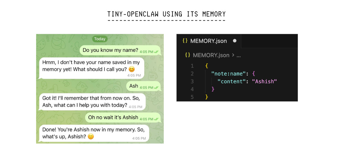 Tiny-OpenClaw’s memory is a simple key-value store (dictionary) that persists data as a JSON file on disk. It is used to store user preferences and facts for the LLM agent to retrieve later.