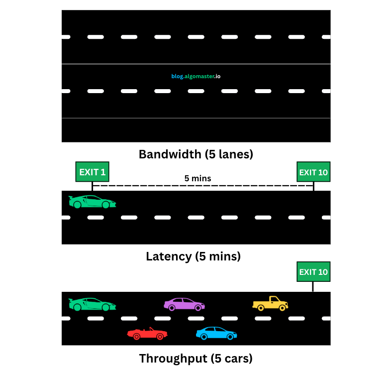 Bandwidth: The number of lanes on the highway (e.g., 5 lanes). This is the maximum physical capacity of the road.