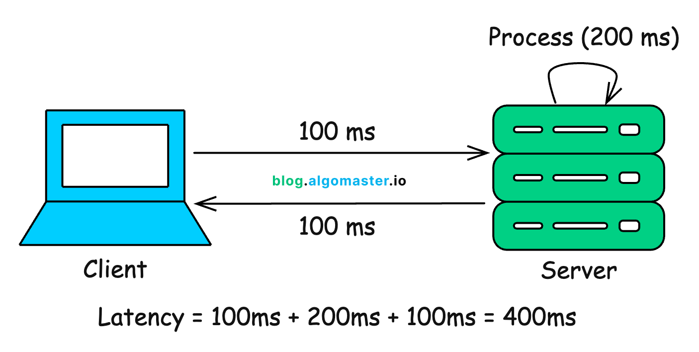 Example: When you make an API call, the latency is the time between your client sending the HTTP request and receiving the first byte of the response.
