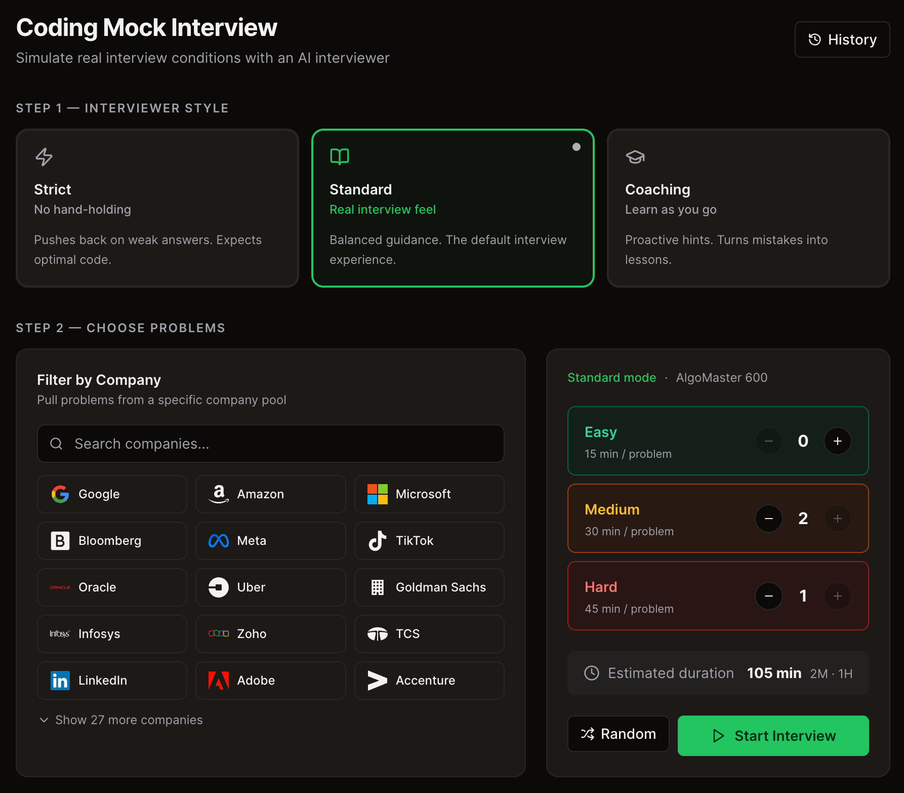 AI powered Coding Interview Simulator: A new feature to practice in a realistic interview environment and receive AI-driven feedback on your approach, code quality, and overall problem-solving process.
