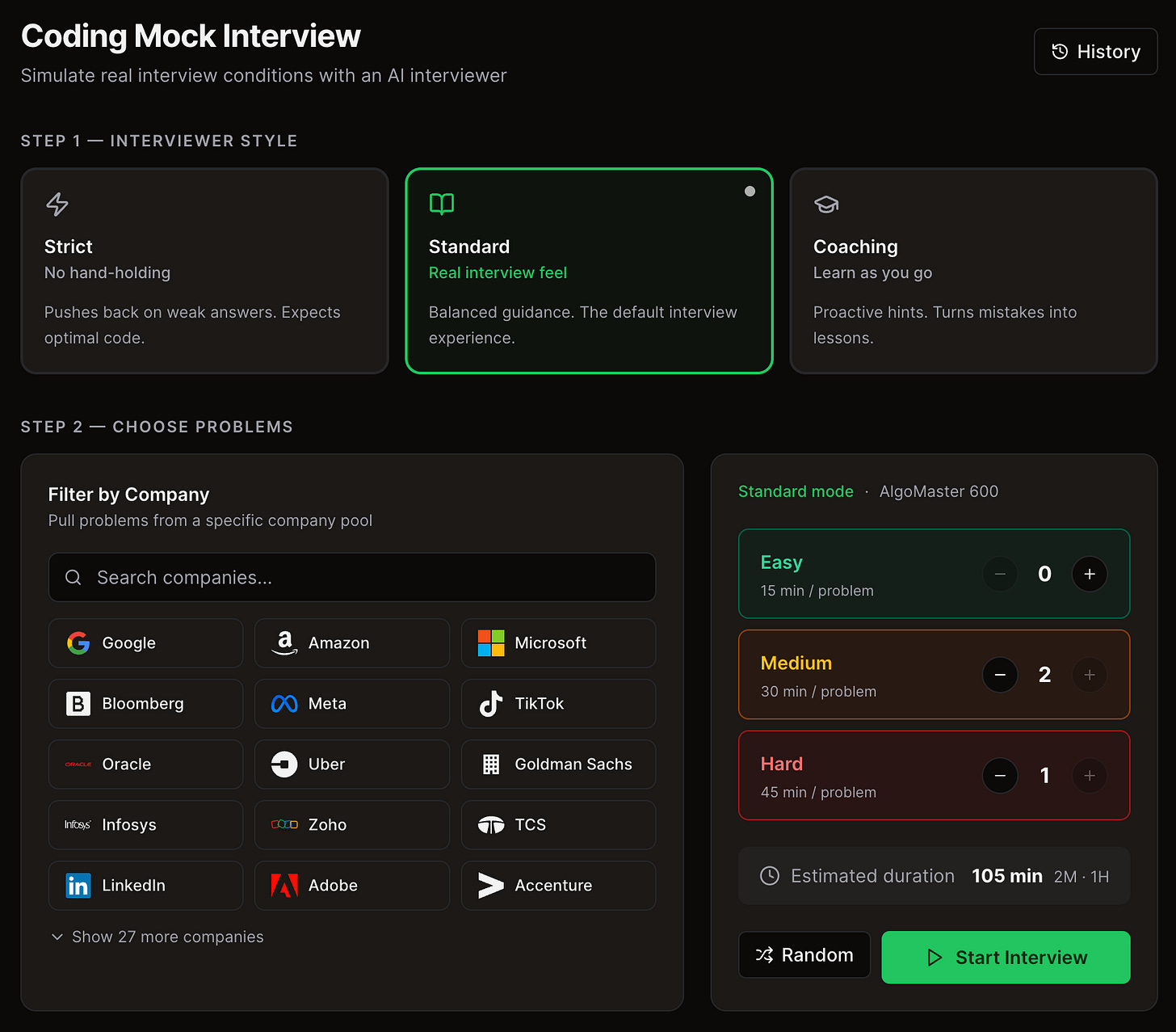 It also includes a voice mode (premium feature), allowing you to explain your approach out loud while the AI interviewer responds in voice, just like a real interview. You can choose from different interviewer personas such as strict, balanced, or coaching.
