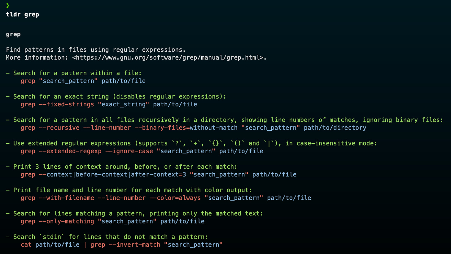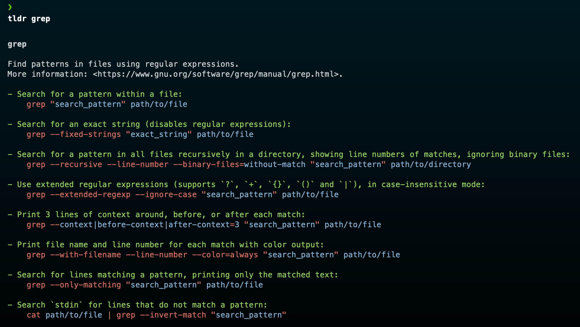 tldr ("Too Long; Didn't Read") is a command-line tool that provides quick and practical examples of how to use commands without going through the extensive and sometimes overwhelming traditional man pages.