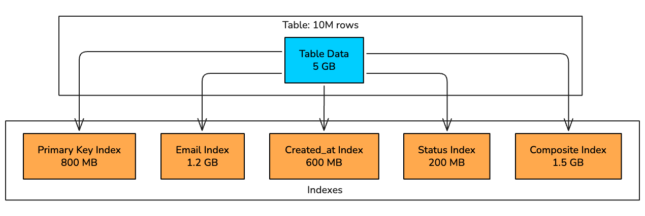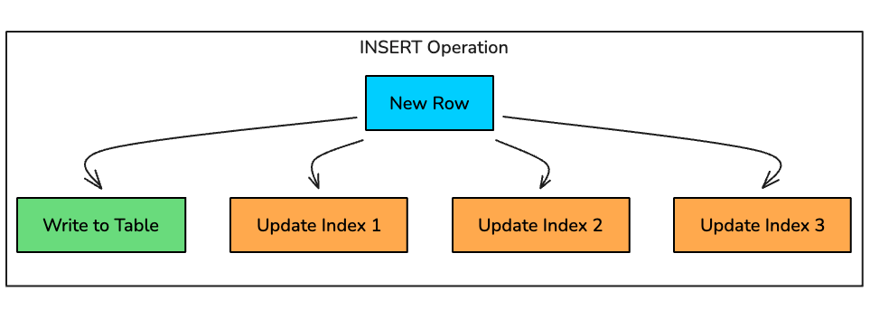 Consider a table with 5 indexes. Every INSERT now requires 6 write operations instead of 1. The overhead compounds quickly:
