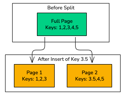 If the target index page is already full, the database performs a page split: it allocates a new page and redistributes the entries across the two pages. Splits keep the tree balanced, but they often leave both pages only partially filled.