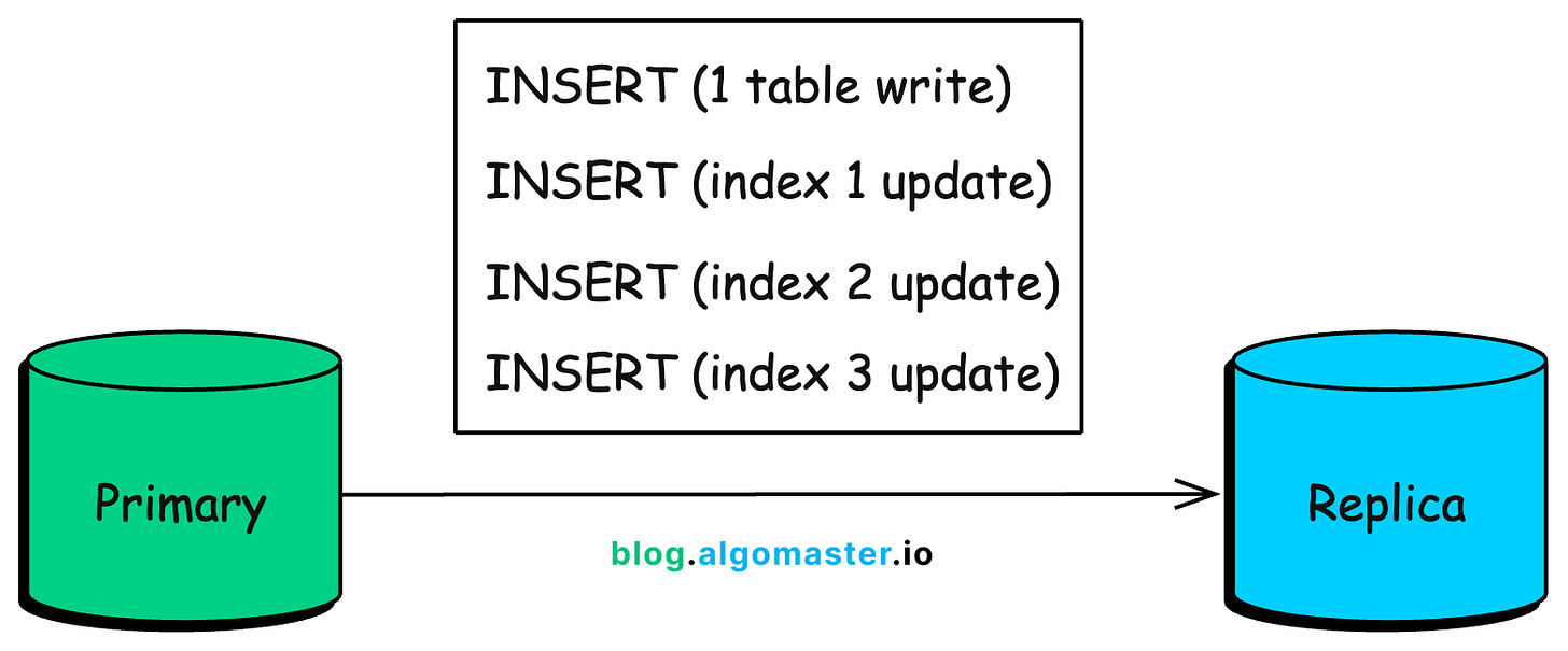 This becomes painful when you do bulk writes. Index-heavy tables can create significant replication lag because replicas have to replay a much larger stream of changes.
