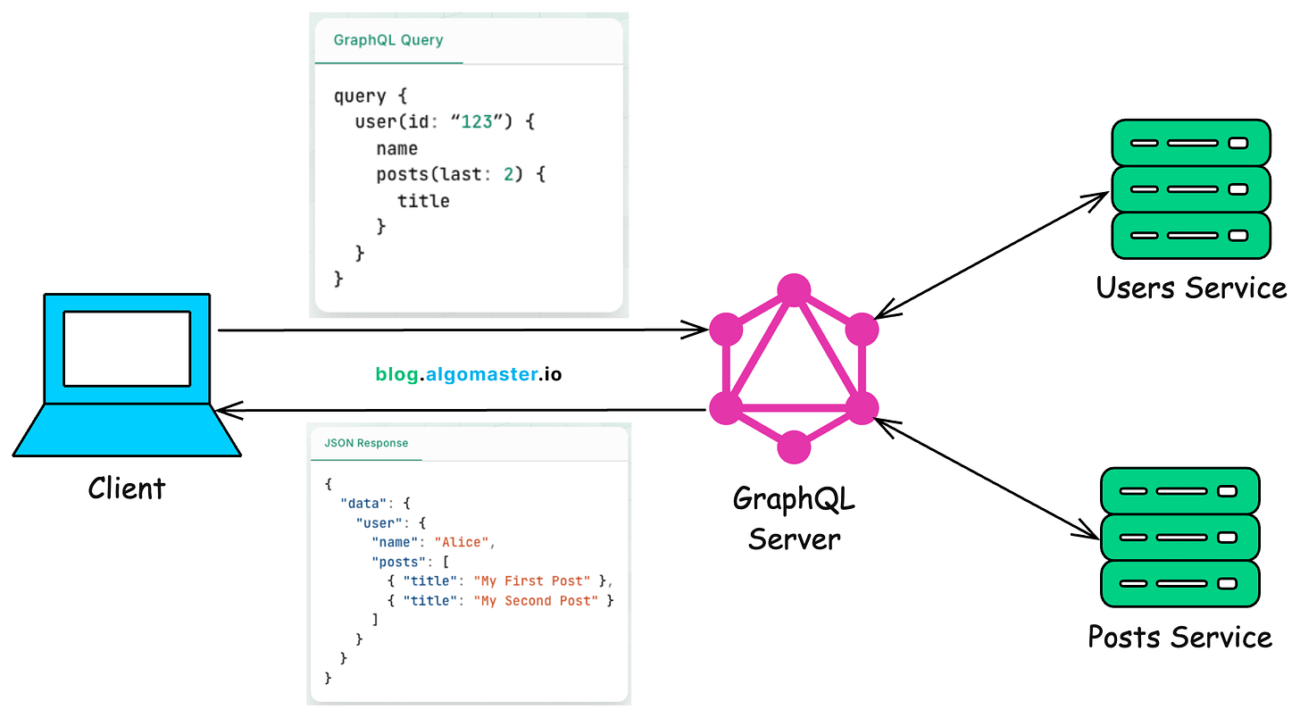 This single query can pull from multiple sources (like a user database and a post database) and return it all in one response.