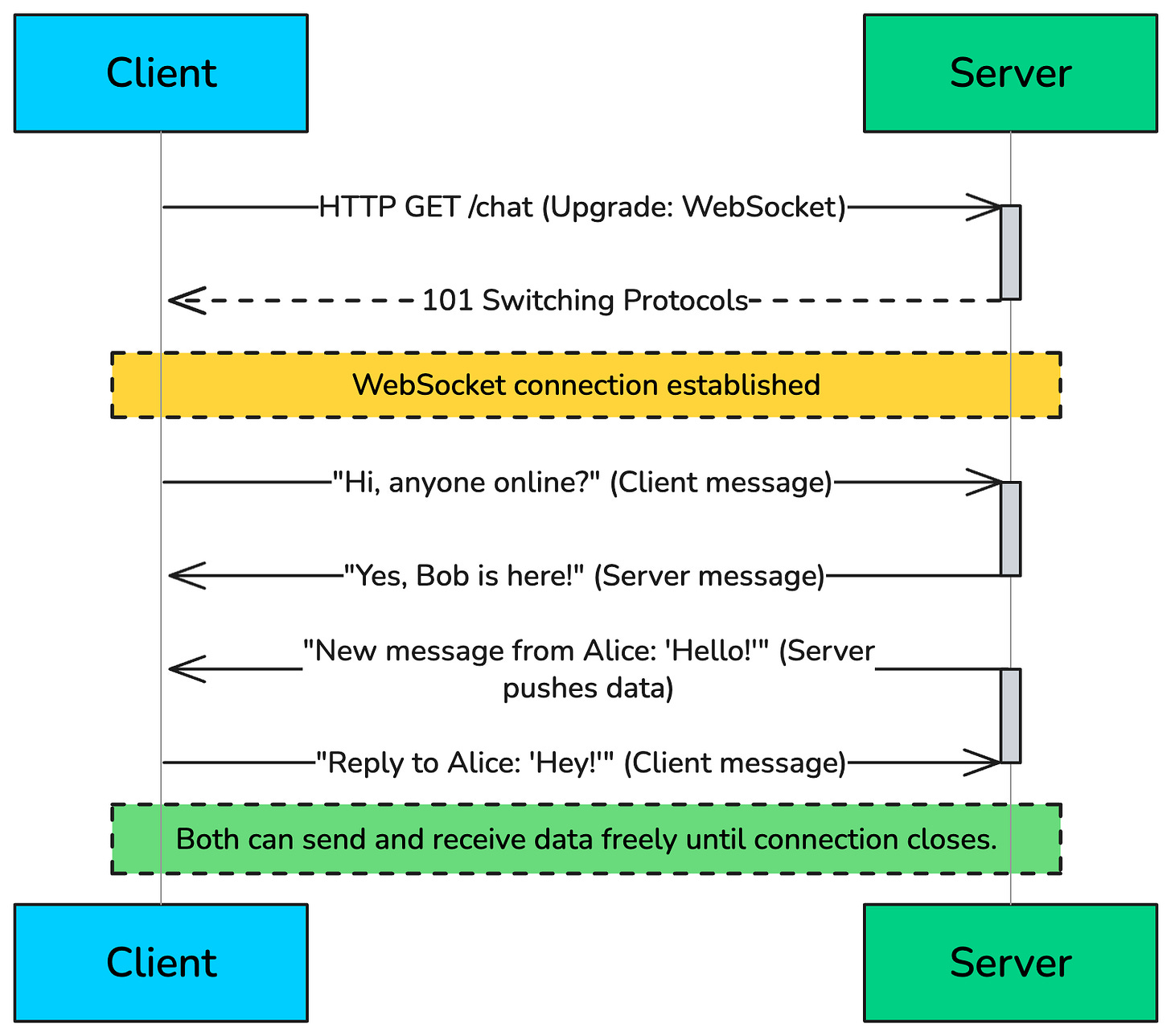 The connection begins as a normal HTTP request, then upgrades to a WebSocket. After that, both client and server can send data to each other whenever they want without new requests.