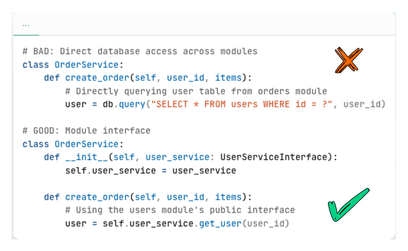Even within a monolith, modules should communicate through well-defined interfaces. Don’t let the Orders module directly access User database tables. Have it call the Users module’s public interface.