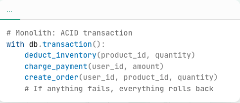 In microservices, each service has its own database. You can’t have a transaction span multiple services. Instead, you need distributed transactions or saga pattern - both are complex and error-prone.