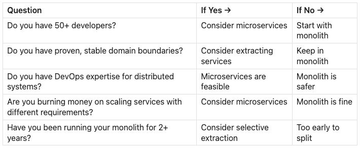 If you answered “No” to most of these, a monolith is almost certainly the right choice.