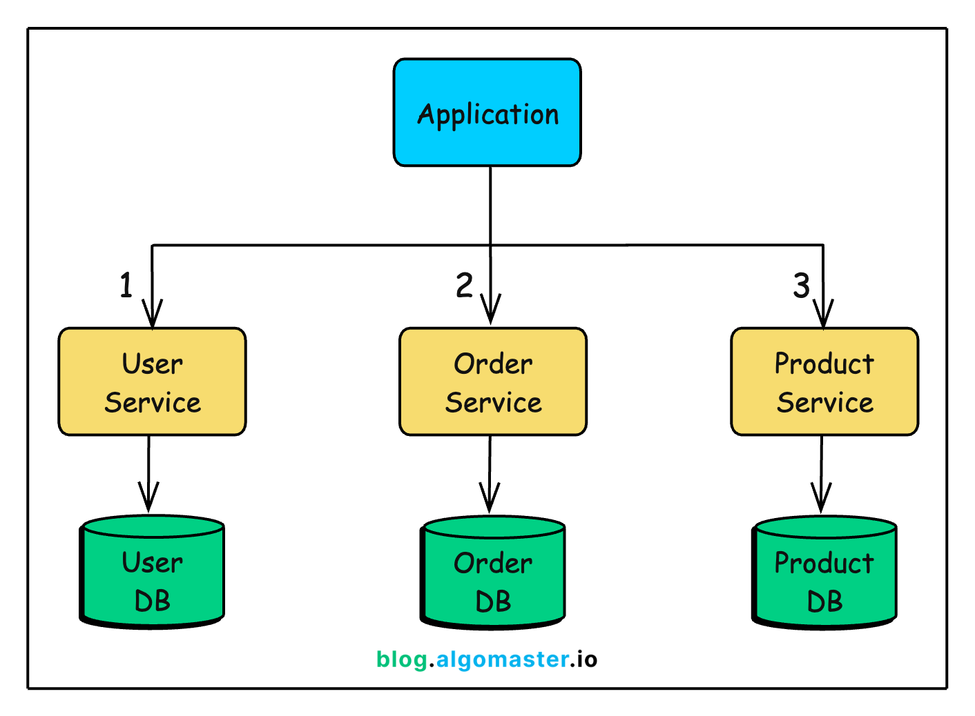 WHERE u.id = 123;In microservices, the same data lives in different databases:
